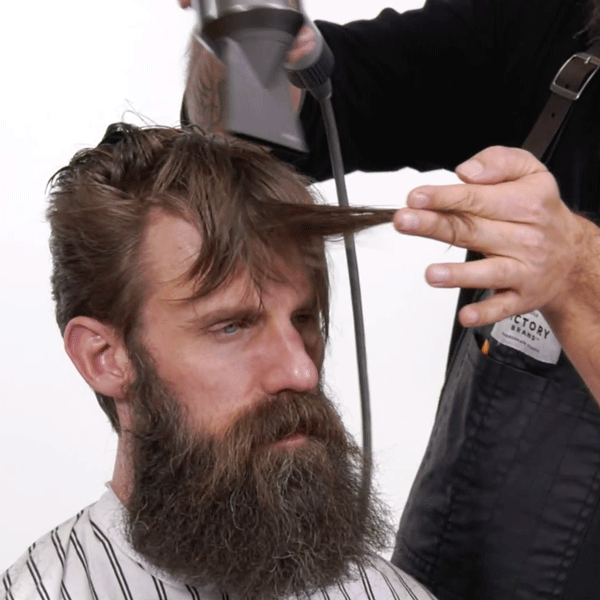 - At the hairline, bring the hair completely over the face and then smooth it back. “Guys don’t think about overdirection when styling,” Matty explains. “So explain to them that to create volume, pull the hair in the opposite direction of where they want it to fall, blow-dry it at the roots, then smooth it back.” he adds.